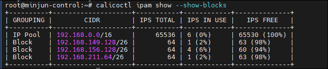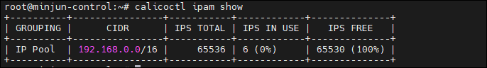 calicoctl ipam show - calico가 관리하는 CIDR 대역을 확인 가능합니다.