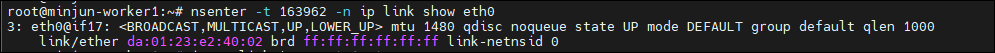 crictl ps --name pod1- Pod의 Container ID 확인crictl inspect <container ID> | jq '.info.pid'- Container의 PID 확인nsenter -t 163962 -n ip link show eth0- Pod에서 eth0에 연결된 Host NIC 확인