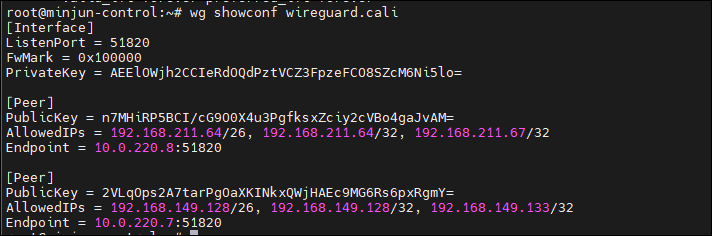 wg showconf wireguard.cali - 패킷 암호화를 위한 공개키/개인키 정보 확인