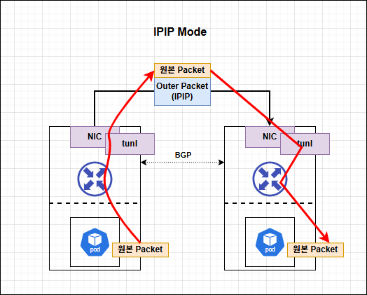IPIP 터널링 모드는 다른 노드간 Pod 통신 시, Pod 정보에 IP헤더를 추가하는 방식입니다.