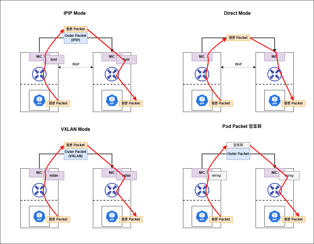 아래는 Calico의 4가지 모드를 도식화하고, 통신 흐름을 빨간 선으로 표시한 것입니다.