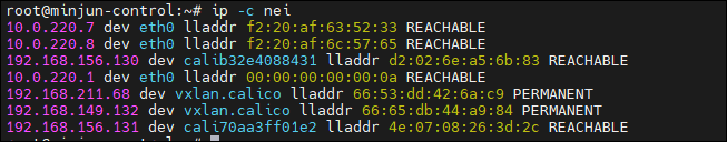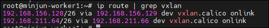 라우팅 테이블 확인 시 vxlan.calico 인터페이스가 추가되어, vxlan 모드가 적용됨을 확인 가능합니다.