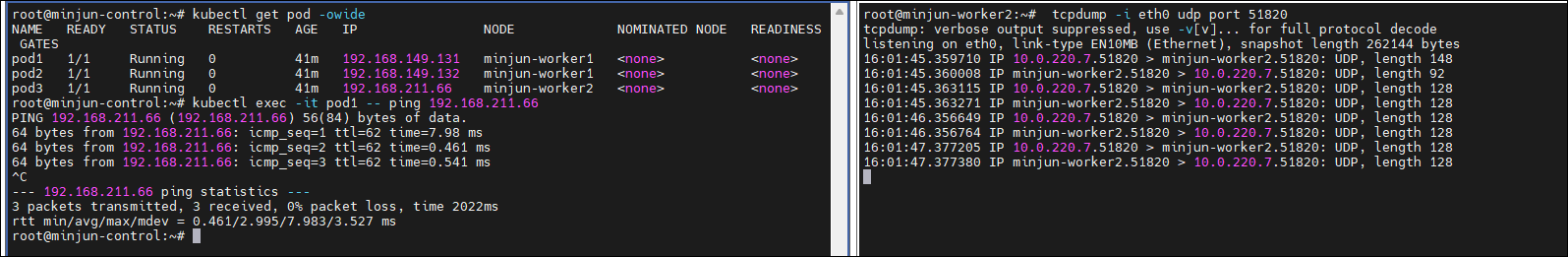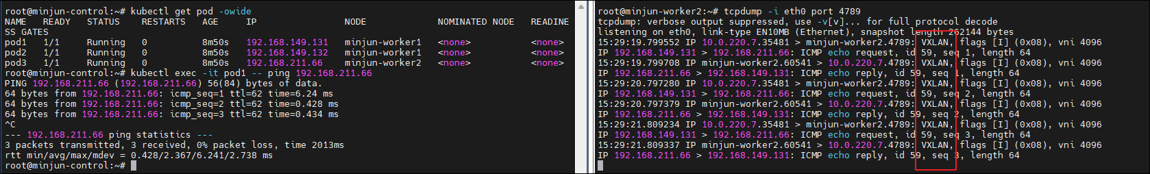 tcpdump -i eth0 udp port 4789 - Cloud 환경일 경우 반드시 보안 그룹에서 UDP로 해당 Port 오픈kubectl exec -it pod1 -- ping <pod3 IP>