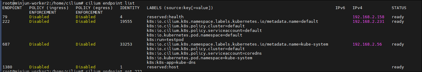 kubectl -n kube-system get pod -l k8s-app=cilium -owidecilium pod로 접근합니다.