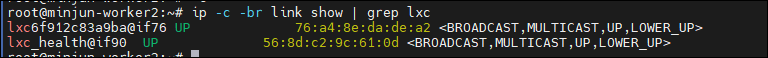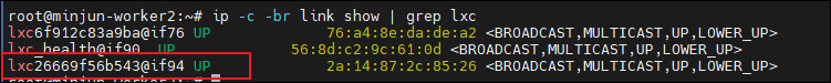 worker2 node로 접근하여, lxc NIC를 확인해보니 확인된 정보로 Pod와 매핑됨을 알 수 있습니다.