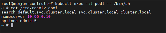 실제 파드 생성 후, /etc/resolv.conf 파일 확인 시, kube-dns의 ClusterIP가 nameserver로 설정되어 있습니다.