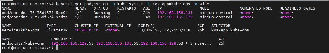 즉, Pod 내부에서의 모든 DNS 요청은 해당 ClusterIP로 전달되고, 이 IP는 실제로 CoreDNS가 백엔드단에서 처리합니다.