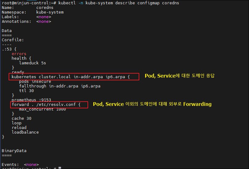 CoreDNS는 내부 DNS 요청만 처리하는 것이 아닌, 외부 DNS 요청도 forward 플러그인을 통해 처리할 수 있도록 설정되어 있음