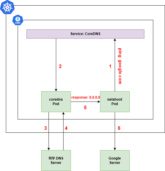 Corefile에 forward . 8.8.8.8 설정이 담겨있음ping google.com 명령이 ping x.x.x.x 처럼 동작하게 됨netshoot Pod는 얻은 IP를 통해 실제 google 서버에 패킷을 전송/수신 가능