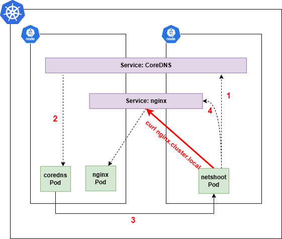 curl http://nginx인 경우 아래와 같은 순서로 조회하며, 조회된 DNS 명이 ClusterIP로 resolve됩니다.
