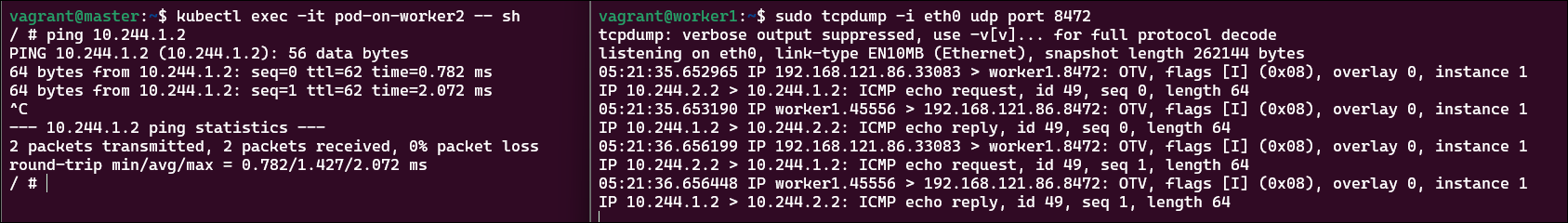 tcpdump 확인 시, worker2에서 worker1로 패킷이 전달되는 것을 확인 가능합니다.