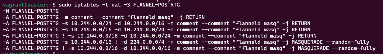-A FLANNEL-POSTRTG -s 10.244.0.0/24 -d 10.244.0.0/16 -j RETURN