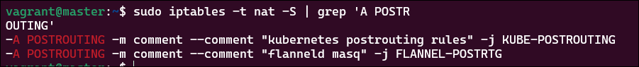 sudo iptables -t nat -S | grep 'A POSTROUTING' - 외부 통신 식별 시, CIDR 값과 같은 별다른 정보 안보이며, "FLANNEL-POSTRTG"와 같은 라우팅 체인만 존재함