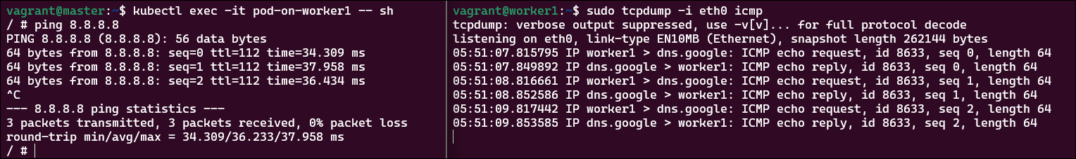 실제 Worker1의 Pod Container 접근 후 외부로 ping 테스트 시, 정상적으로 통신이 됩니다.