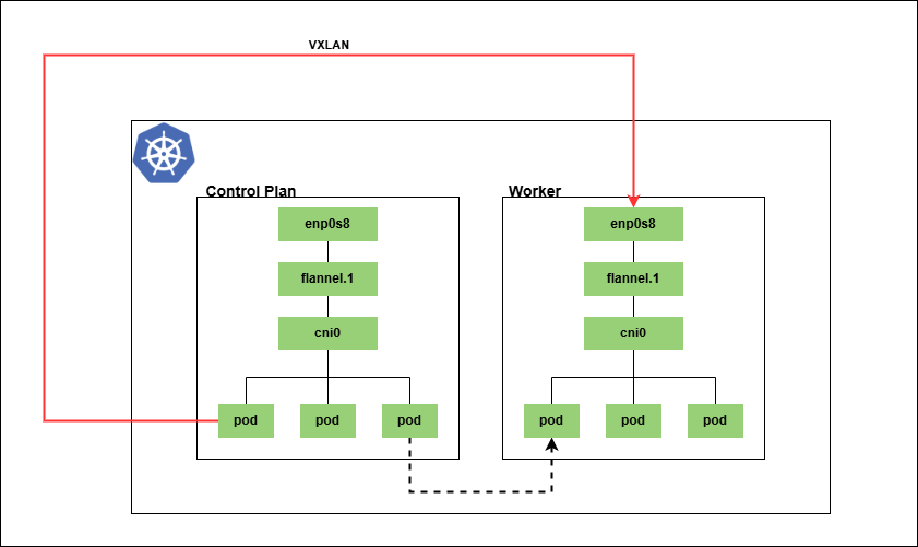 아래 다이어그램은 Flannel 기반 K8s Cluster의 Pod-to-Pod 통신 경로를 표현합니다.