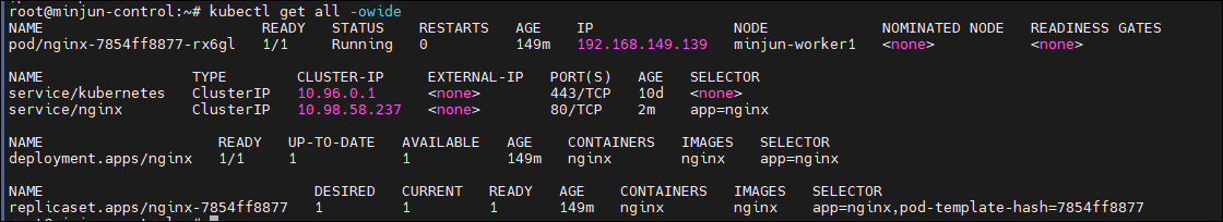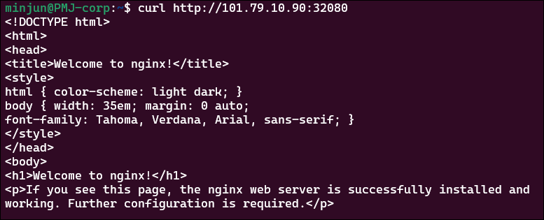 nginx가 생성된 worker node의 <공인IP:nodeport> 로 curl을 하면 nginx가 호출되야 합니다.