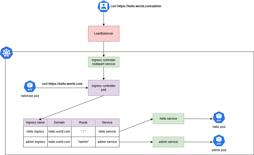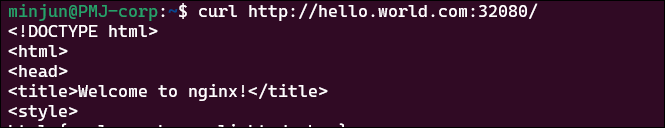 curl -H "Host: hello.world.com" http://101.79.10.90:32080/ -H 옵션을 통해 도메인 resolve 가능