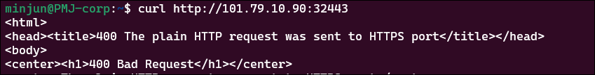 ingress 구성 시, 80 포트를 통해 접근하도록 명시했기에, 443포트를 수신하도록 설정하였어도, 400 code를 줄 뿐입니다.