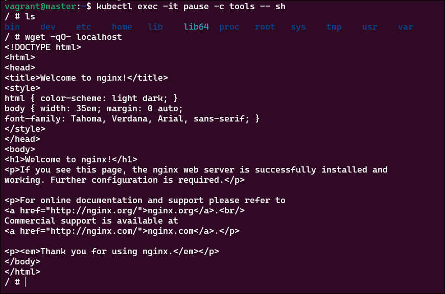 wget -qO- localhost - nginx의 기본 페이지 HTML이 출력되면, 두 컨테이너가 동일한 network 네임스페이스를 공유하고 있다는 결정적 증거입니다.
