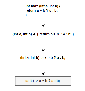 // MyFunction f = (int a, int b) ->a > b ? a : b;