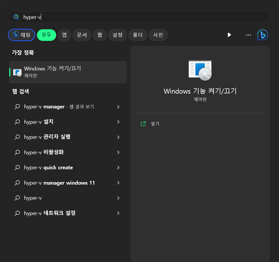 1. window키 → hyper-v 검색 → window 기능 켜기/끄기