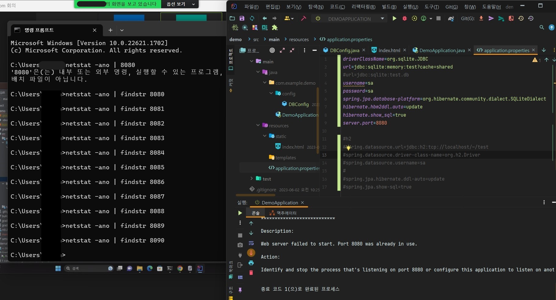 cmd에서 8080 포트의 PID를 조회하기 위해 netstat을 실행시켰지만 조회된 것이 없다. 사용하지 않는 포트 번호들을 확인하고 스프링 프로젝트에 적용했지만 위와 같은 에러가 발생한다.