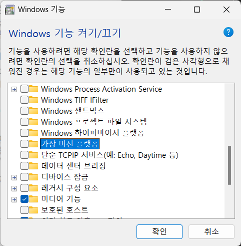- 가상 머신 플랫폼(Virtual Machine Platform) 활성화: '가상 머신 플랫폼'을 다시 체크하고 활성화해야 합니다. 이를 위해 다음 단계를 따릅니다: