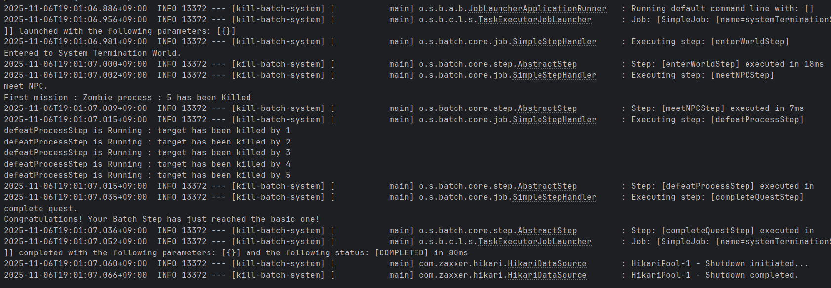 반면에 Boot Batch의 경우 Boot 실행이 곧 Batch 실행이고, 환경구성은 Boot측에서 해주고 나머지 로직구성만 개발자 몫이기에, 사실상 모든 오류는 컴파일러 단계 혹은 실행오류라도 Boot에서 관리하는 CheckedException으로 확인 가능하다.