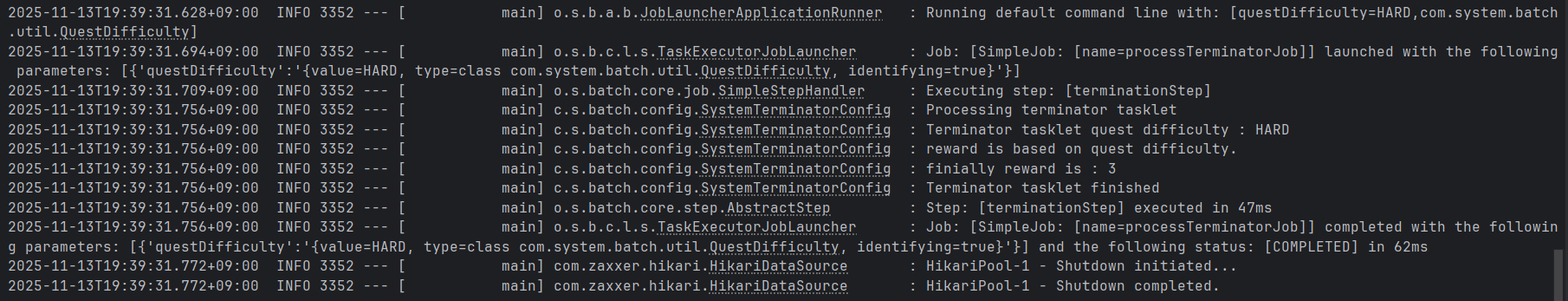 ./gradlew :batch:jobParameters:bootRun --args='--spring.batch.job.name=processTerminatorJob questDifficulty=HARD,com.system.batch.util.QuestDifficulty'