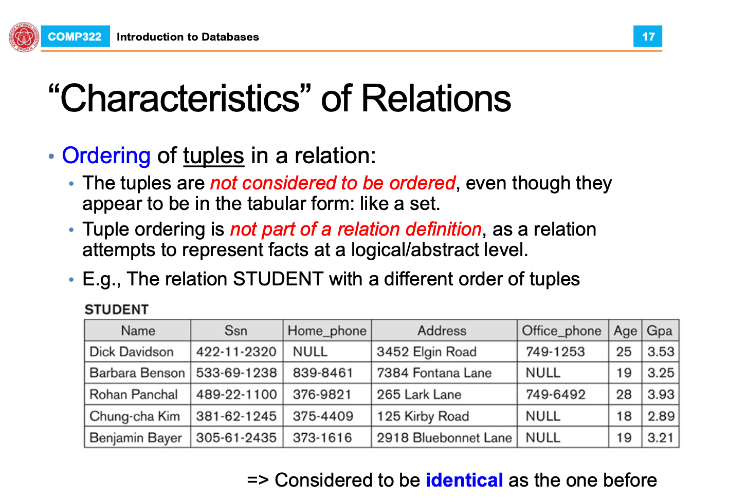 Tuple order 는 고려안하지만 Attribute 순서는 고려해야한다.