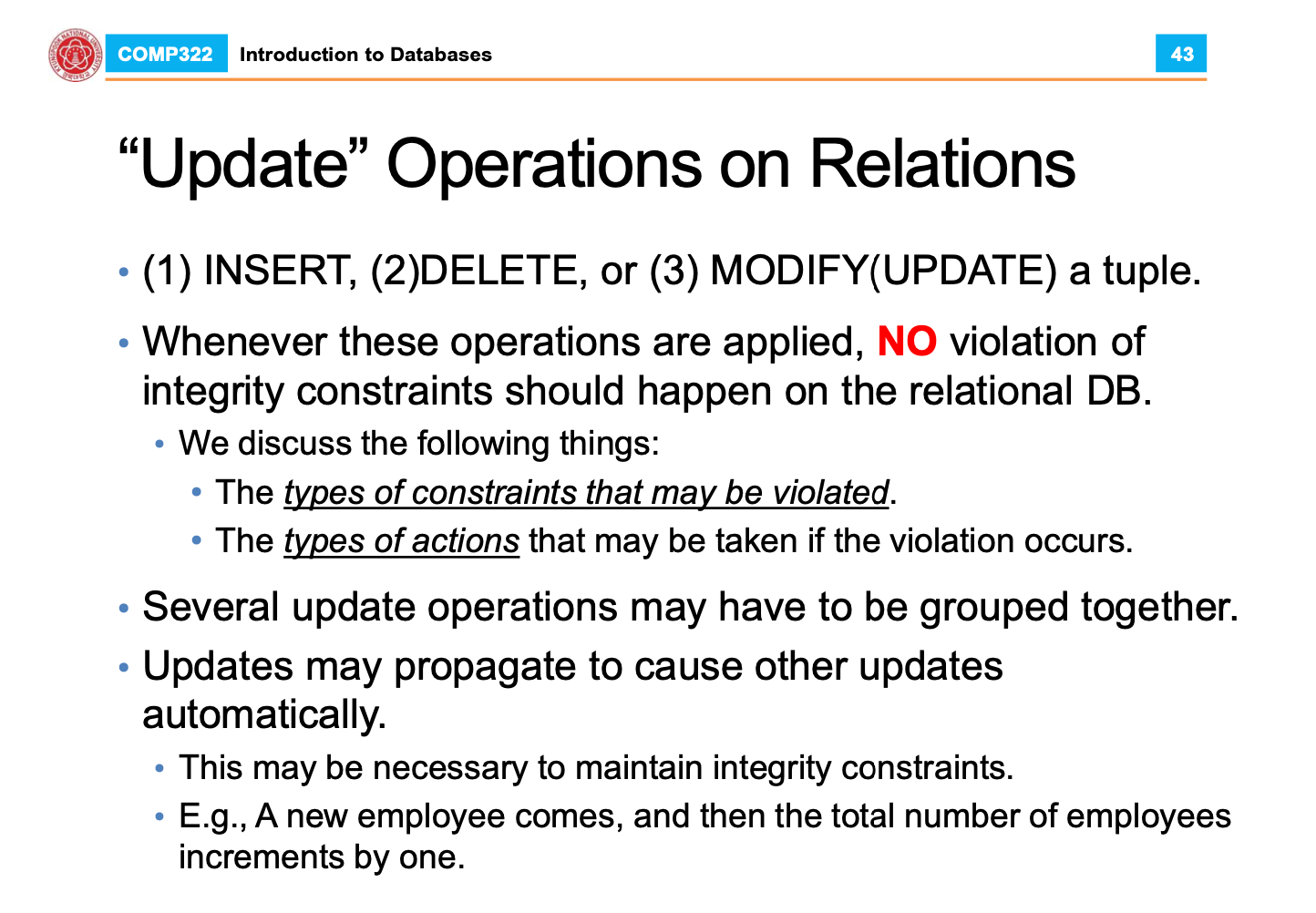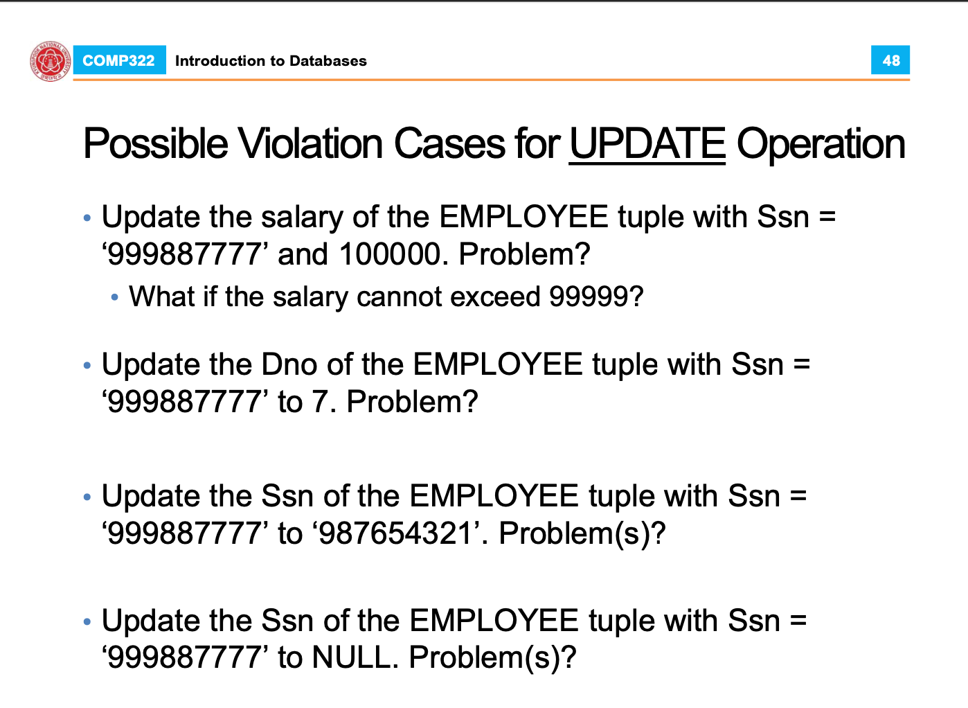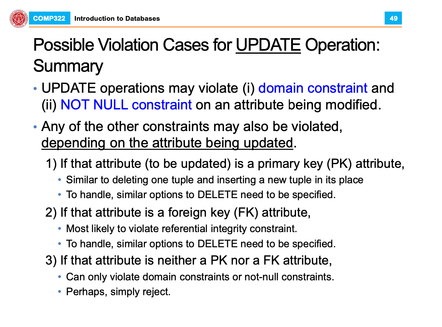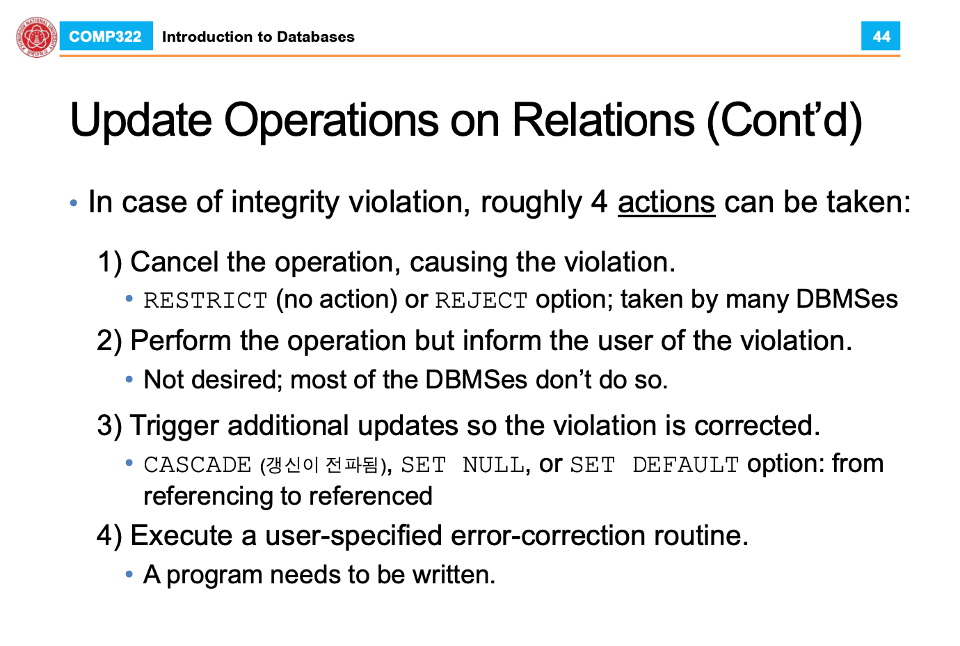 우리는 Update 연산에서 어떤 제약조건을 위반했고 위반했을때 어떤 Action을 해야하는지에 대해서 볼꺼다.