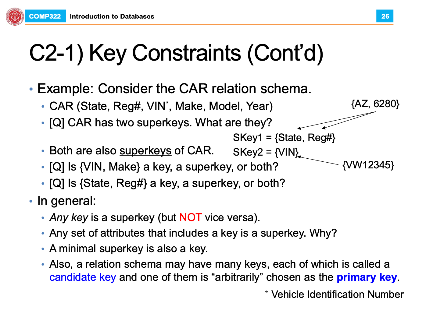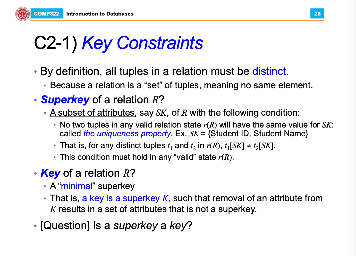 그래서 Superkey 는 key 인가? Superkey 는 key 가 아니다. 하지만 key는 Superkey 이다.