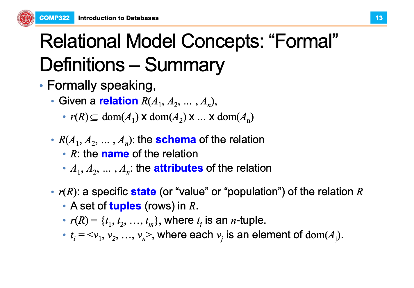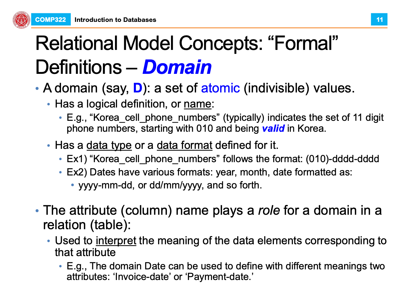 그리고 각각의 attribute 는 Valid 한 값들의 집합의 Domain 을 가지고있다.