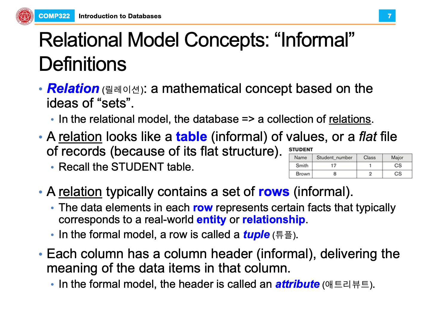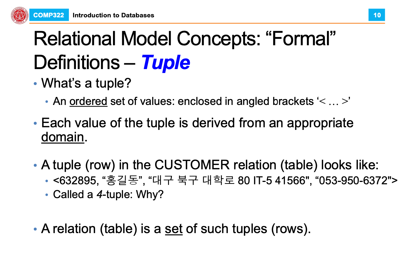 Tuple은 Column 의 Group으로 부른다. 이 Tuple이 모여있는게 Relation.