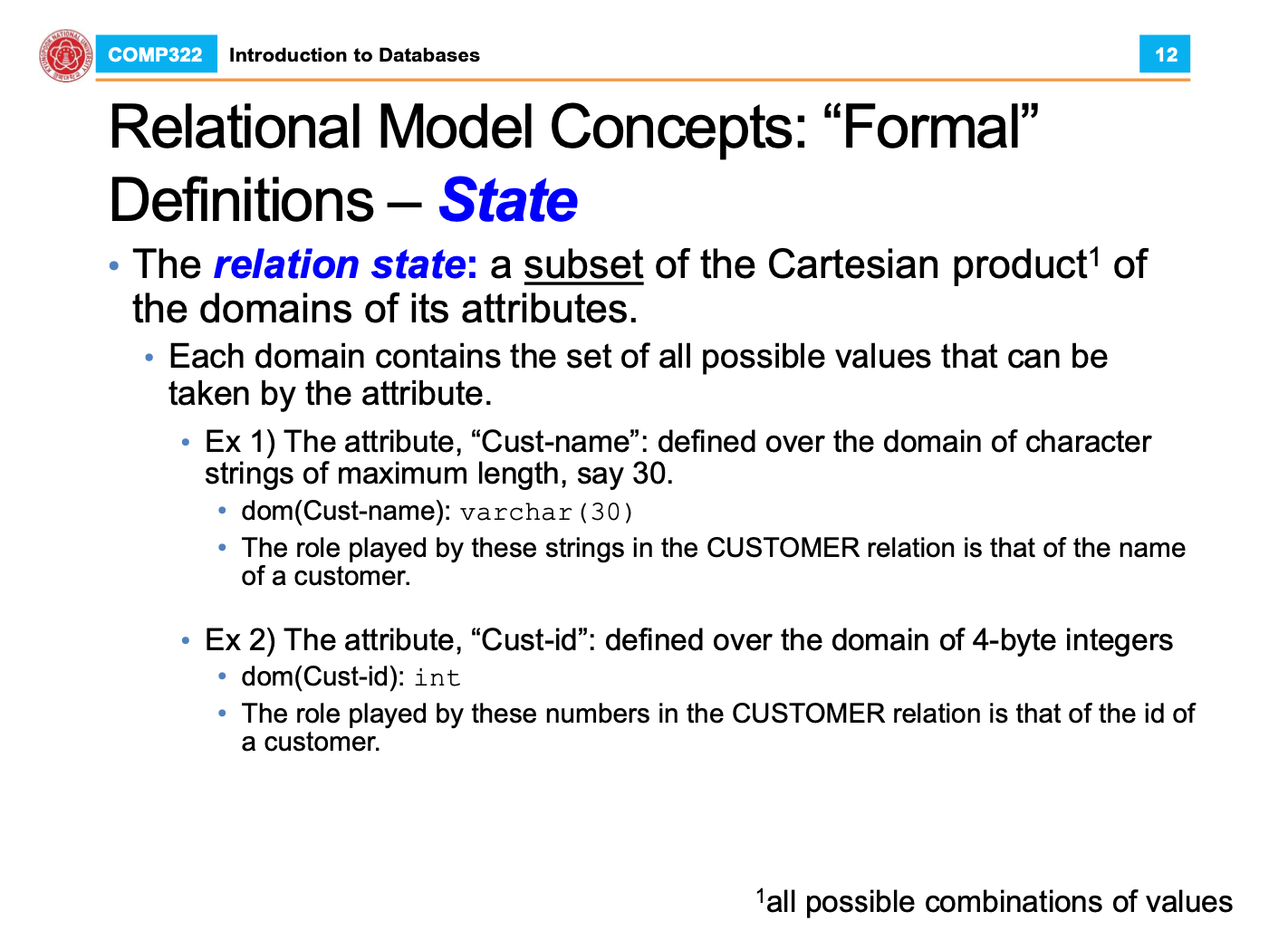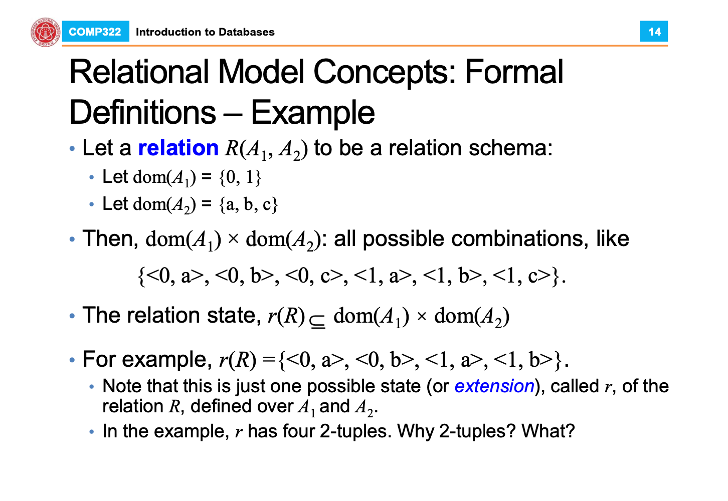 r(R)={<0,a>,<0,b>,<1,a>,<1,b>}인 경우, 이는 가능한 relation state 중 하나이고, r은 4개의 2-tuple을 가진다. (attribute가 2개이므로 2-tuple)