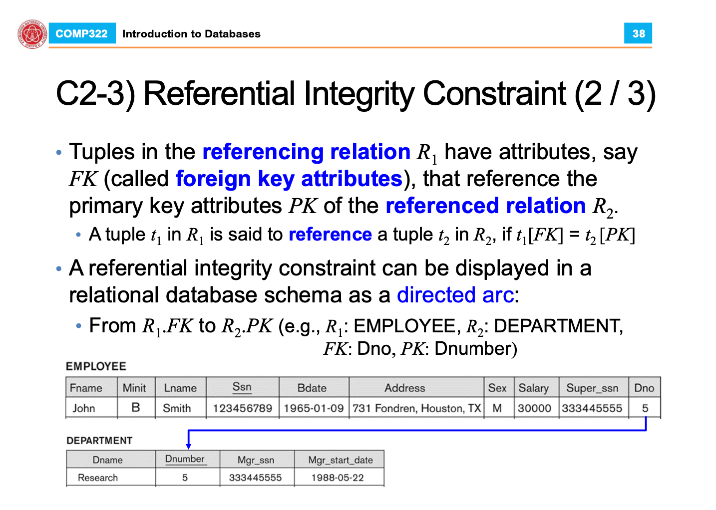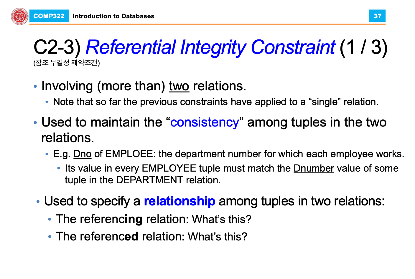 Referential integrity constraints - 참조 당할땐 해당 Entity 가 있어야한다.
