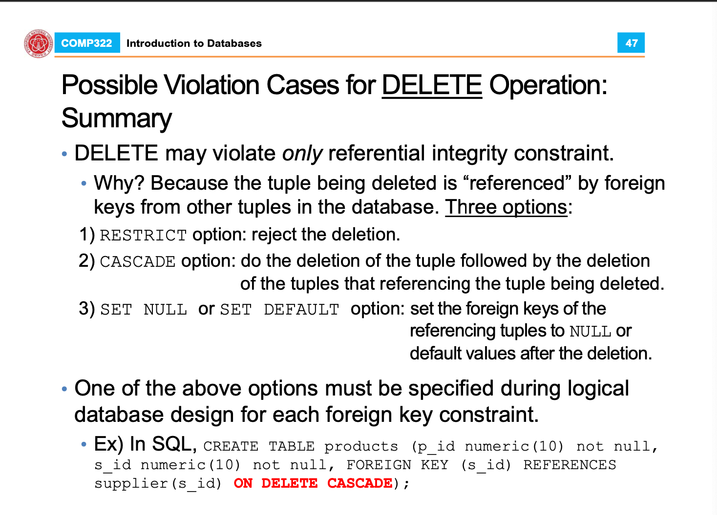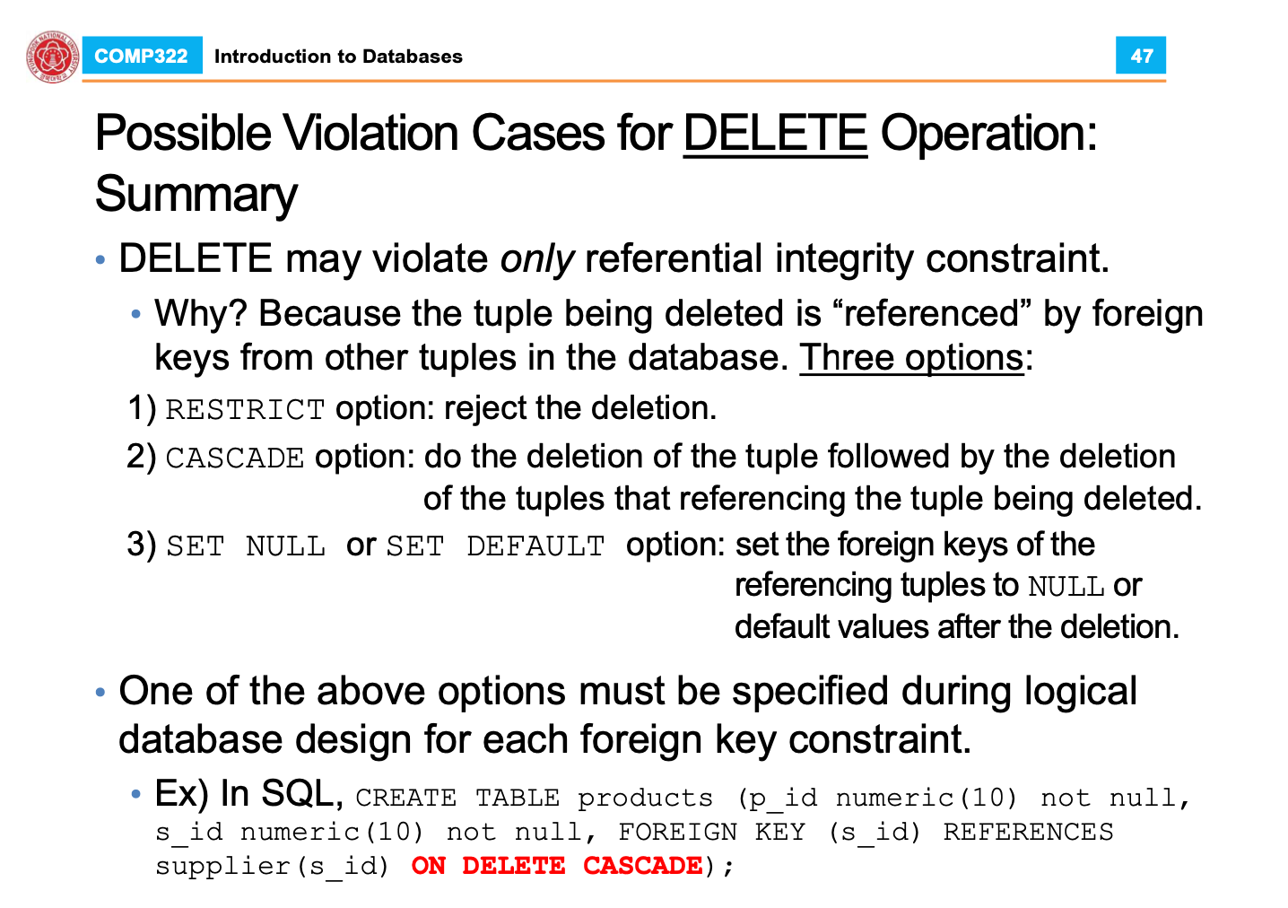 DELETE 는 referintial Constraint 만 Violation 한다. 2번째를 보면 참조하는 tuple 이 있으면 Reject 당한다.