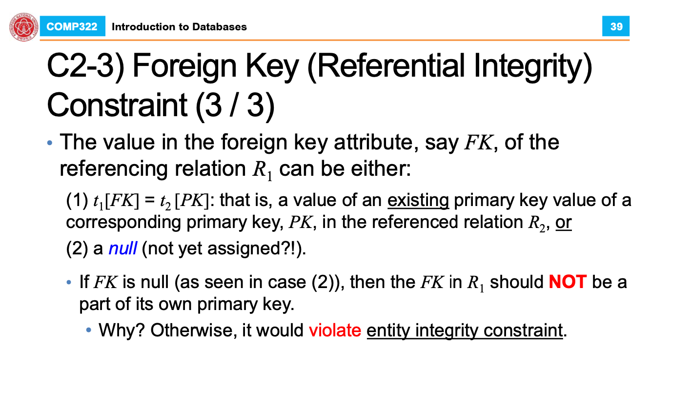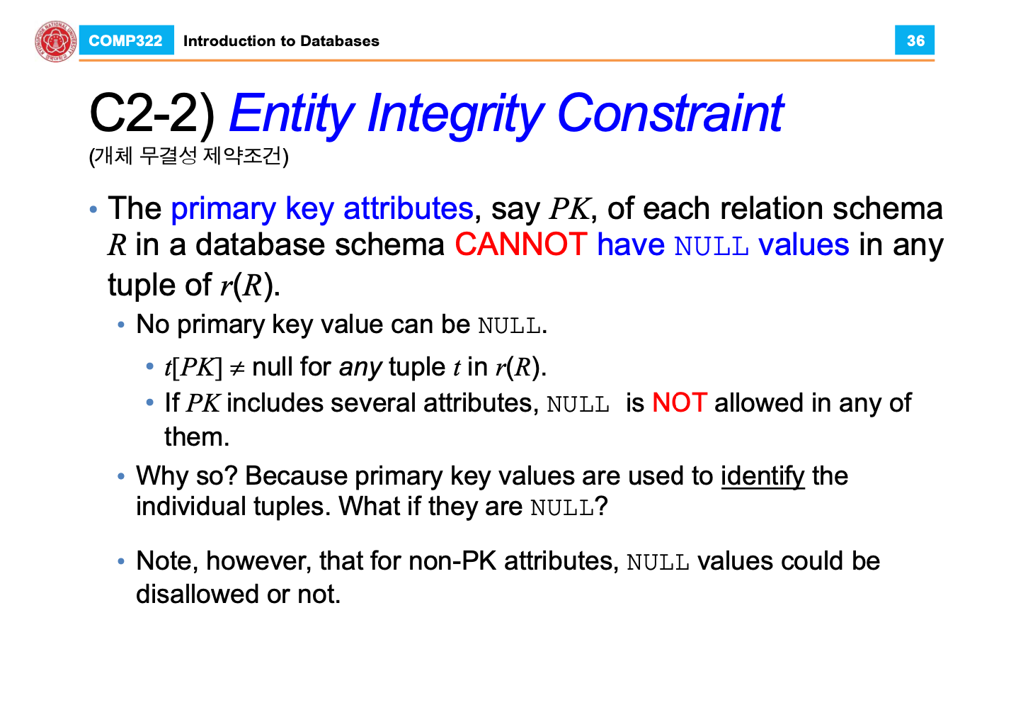 마지막은 Entity integrity constraint 이다. NULL 은 허용 X