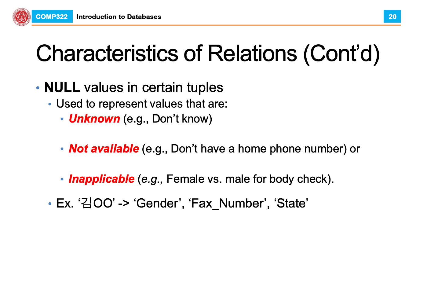 그리고 PK 값에는 여러개의 Attribute 가 허용 가능하다면 그중 어느것도 NULL 이면 안된다. 하지만 PK 값이 아닌 Attribute 에 대해선 Null 일수도 아닐수도 있다.