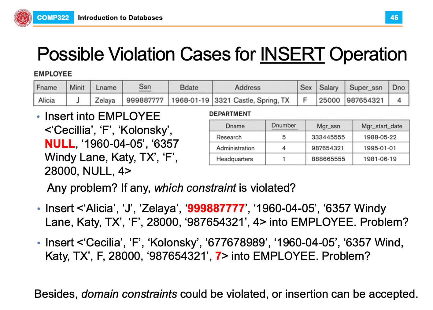 또한 SSN이 같으면 Key Constraint Violation 이 발생한다. PK 가 같은데 어떻게 넣냐 이거다.