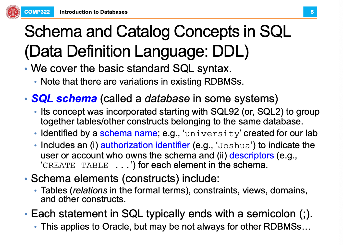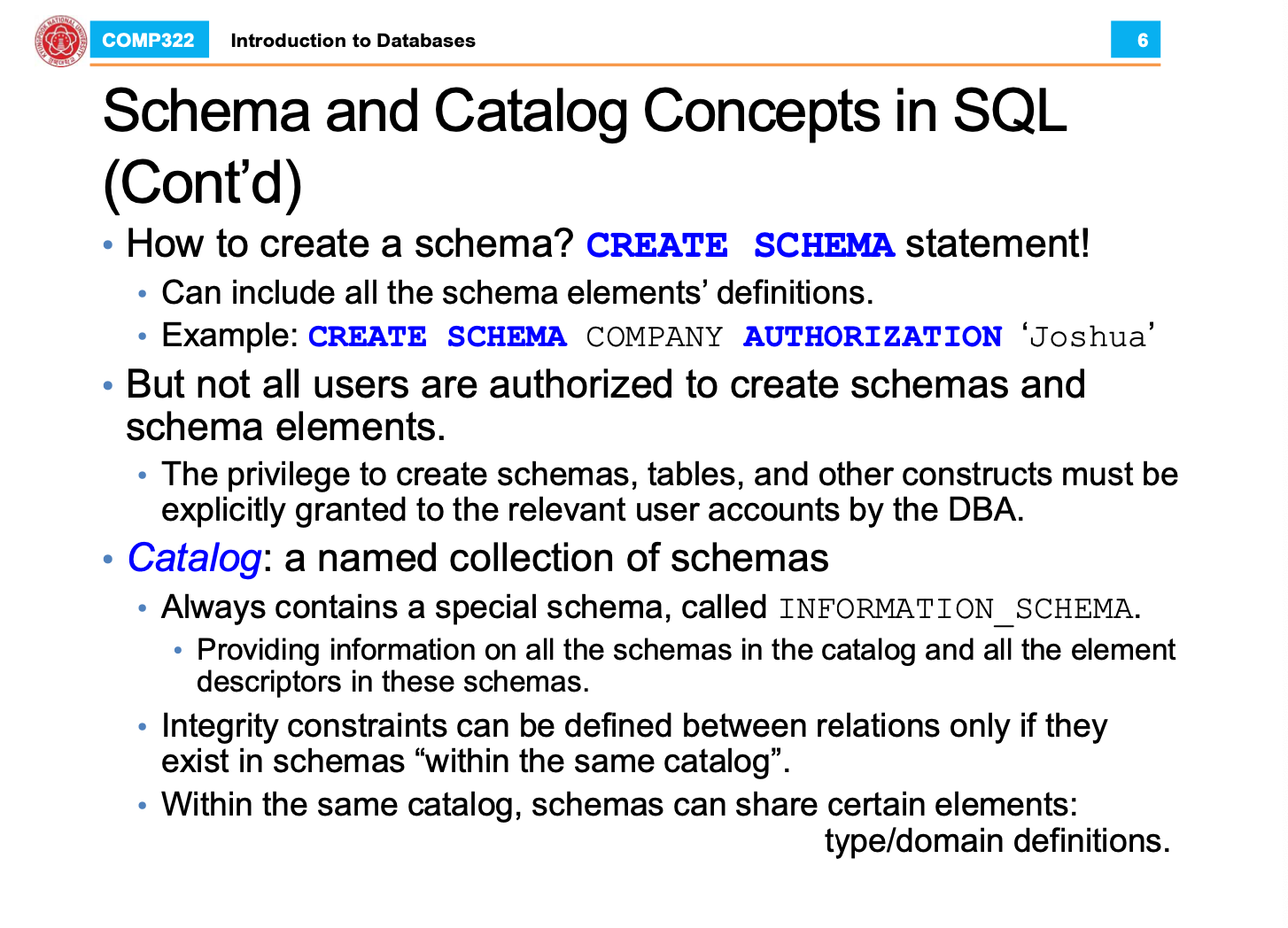 SQL Schema 는 같은 DB 안에 있는 Table 의 모음이고 System Catalog 에 저장이 된다.
