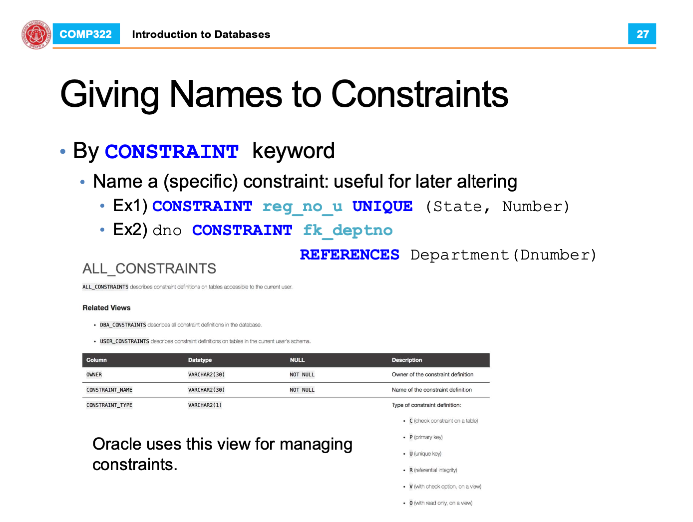 CONSTRAINT reg_no_u UNIQUE (State,Number) 는 명시적으로 이름을 주는것으로 적시하지 않으면 System 이 자동으로 이름 만들어 낸다. 그것을 Catalog 에 저장한다.
