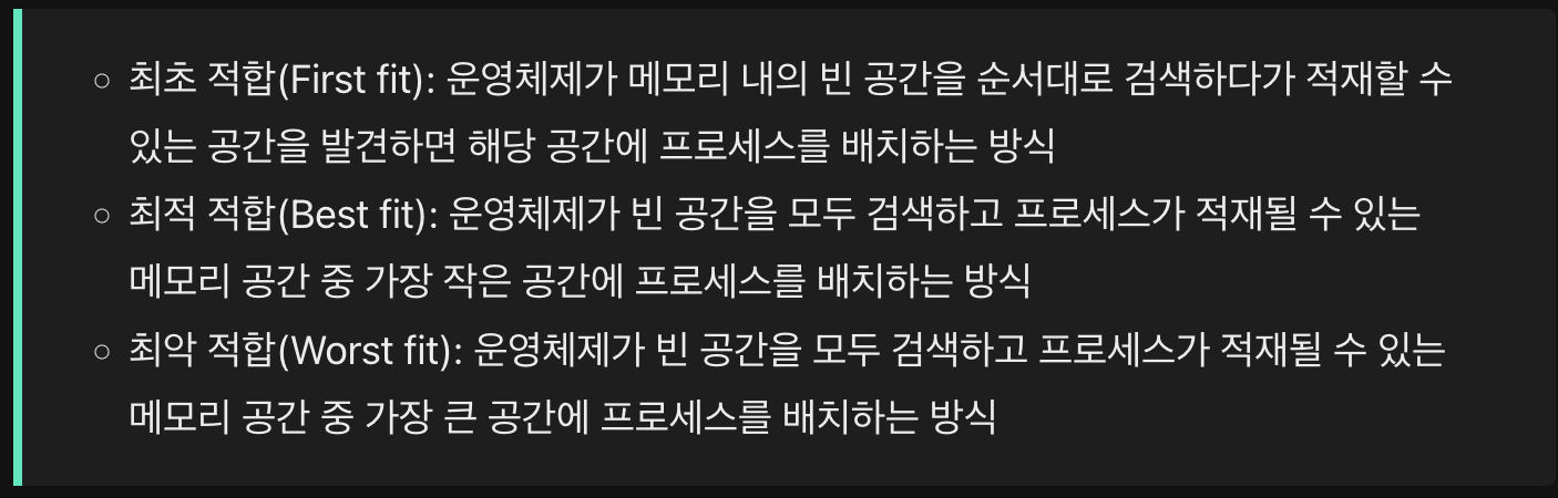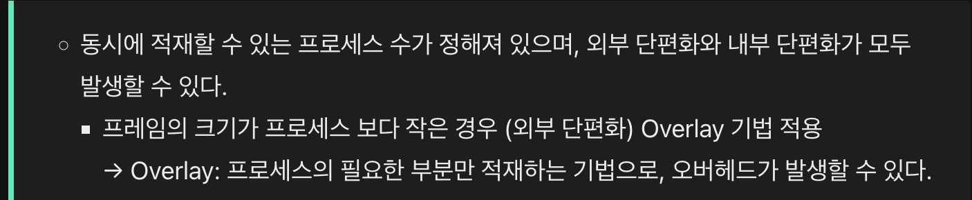 프로세스의 크기에 맞춰 필요한 메모리를 동적으로 할당하는 방식으로 외부 단편화가 발생할 수 있다.