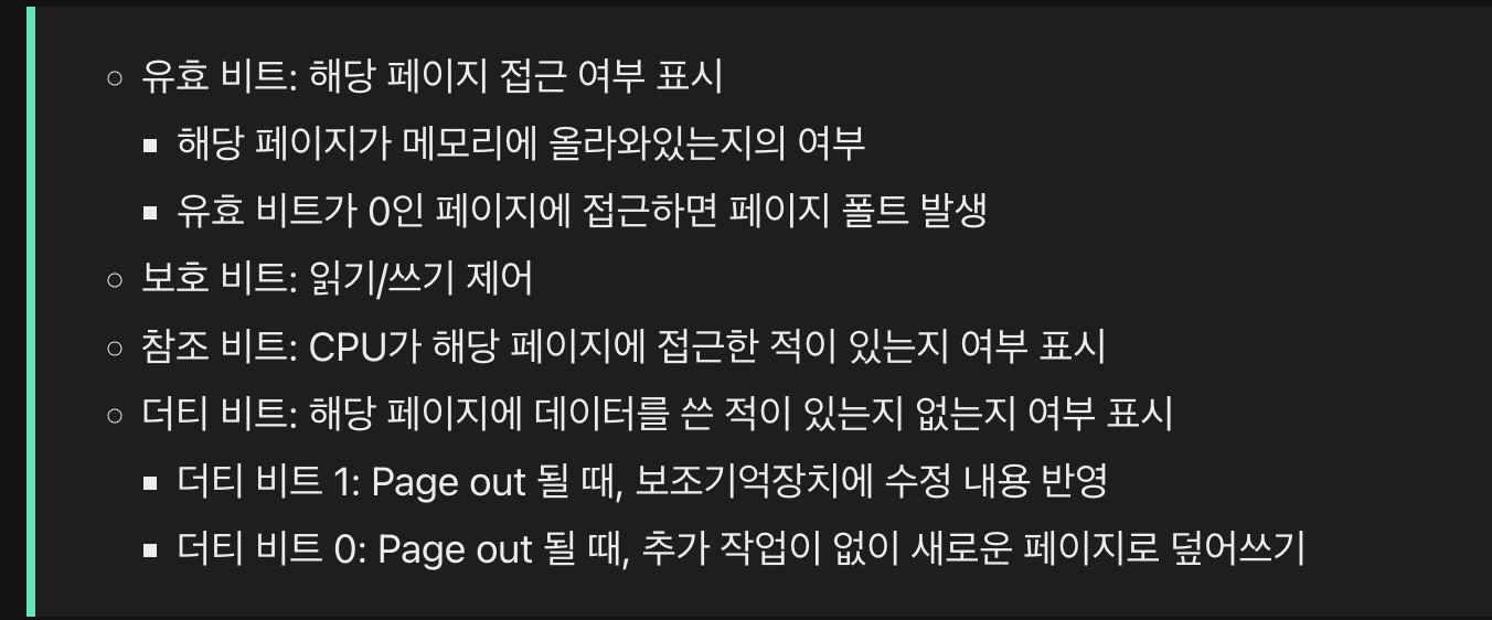 Page Table entry - 페이지 테이블 각각의 행으로 유효비트,보호비트,참조비트,수정비트 를 가지고 있다.
