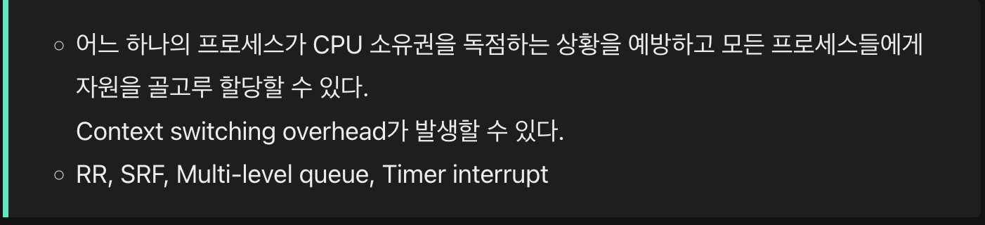 Preemptive Scheduling 은 프로세스가 CPU 를 사용하고 있더라도 운영체제가 프로세스로 부터 CPU 소유권을 강제로 뺴앗아 다른 프로세스에게 할당할 수 있는 스케쥴링 방식