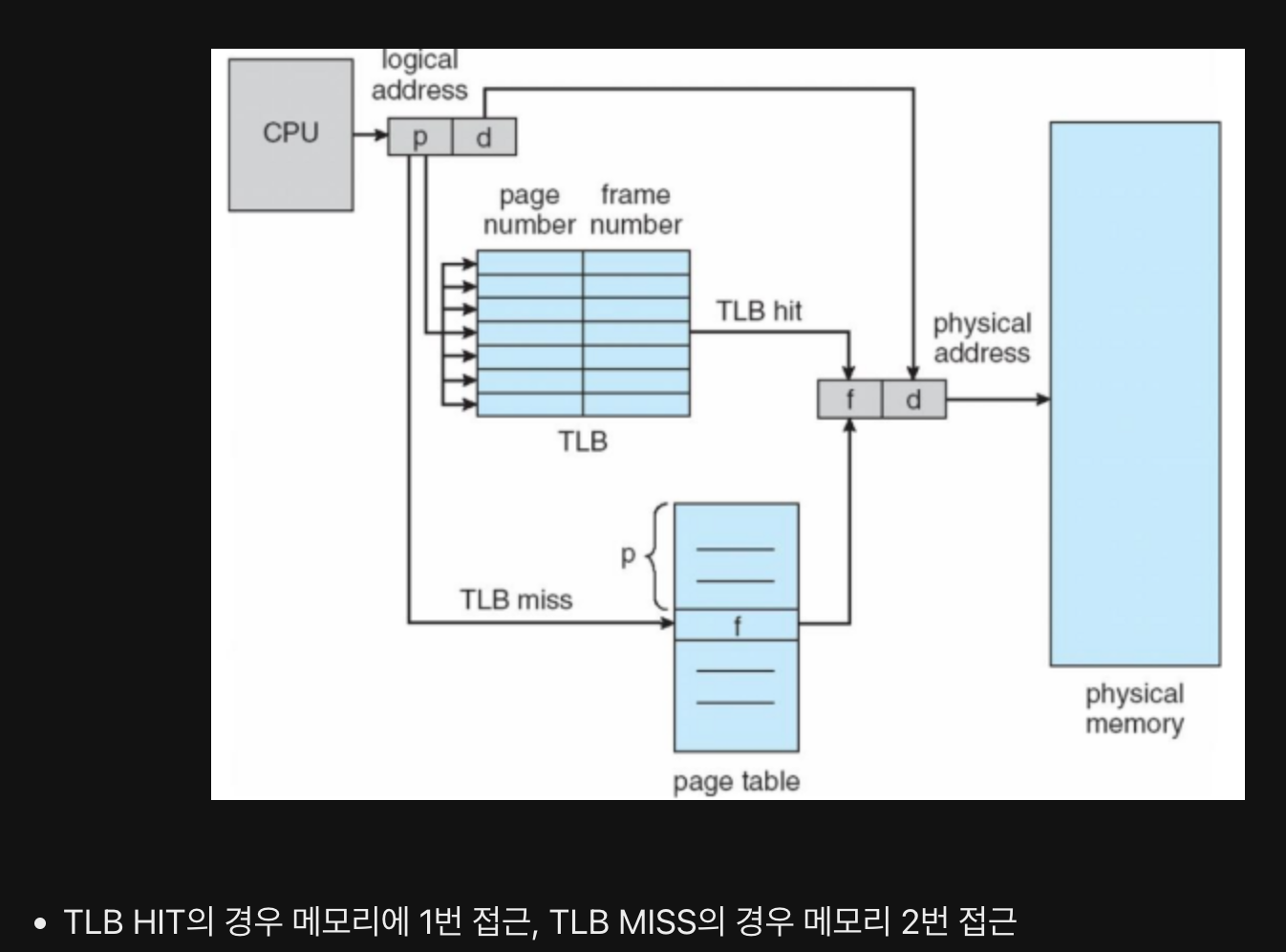 Translation Lookaside Buffer - 페이지 테이블을 사용하면 페이지 테이블을 참조하기 위해 한번, 프레임에 접근하기 위해 한번 총 두번의 메모리 접근이 발생한다.