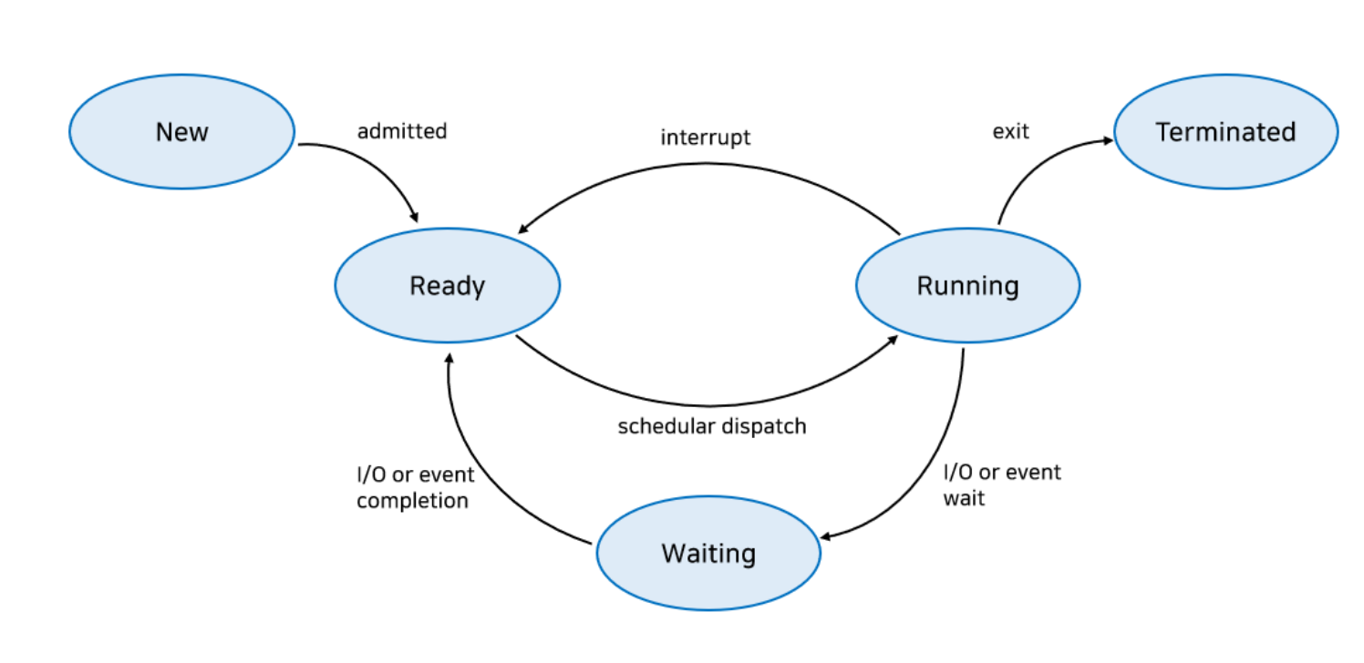Ready - > Running(Dispatch) : CPU 를 할당 받으면 실행 상태로 바뀌고 실행된다.