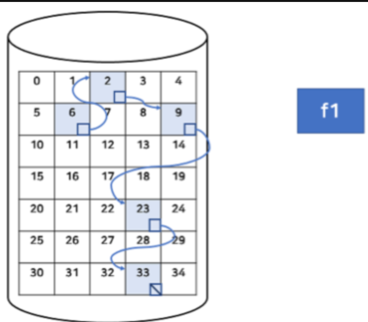 각각의 블록에 다음 블록 주소를 저장하여 각 블록이 다음 블록을 가리키는 연결리스트 형태로 할당하는 방식