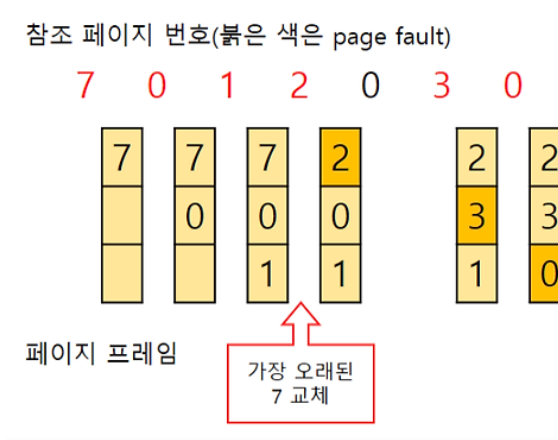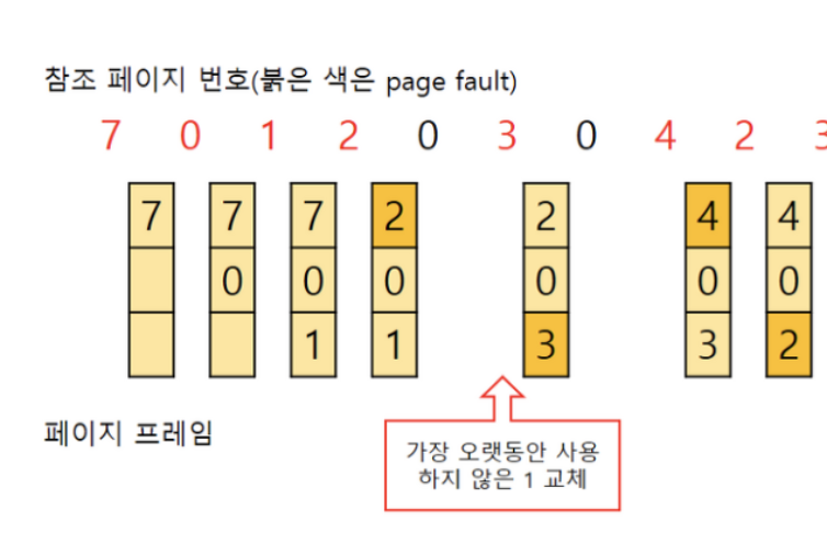 Least Recently Used 로 가장 오랫동안 사용하지 않은 페이지를 교체하는것이다.