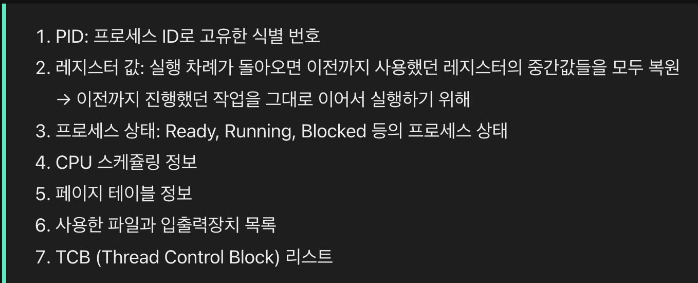 Process Control Block 으로 프로세스에 대한 메타데이터를 저장한다.